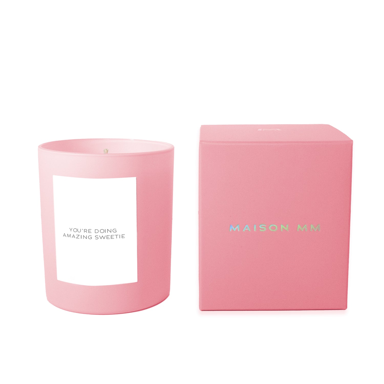 Hand poured 100% soy wax blend candle in Raspberry Marshmallow fragrance. This is the perfect candle reminder that you are doing just fine, in fact you're doing amazing sweetie. Let this candle act as a reminder that you are amazing, or gift it to a friend who needs a little support and motivation. Plus, it adds a cute and fun aesthetic to any setting.